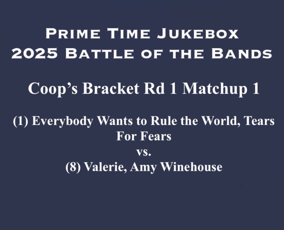 We go to Coops Bracket to the 1-8 matchup and it’s (1) Everybody Wants to Rule the World by Tears For Fears vs. (8) Valerie by Amy Winehouse