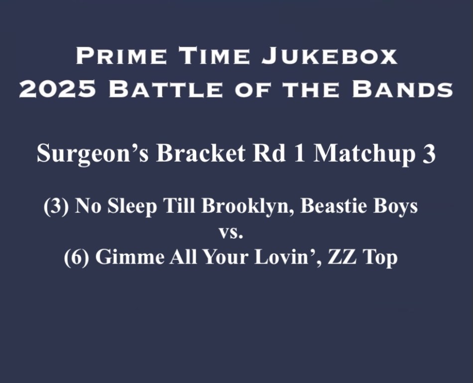 We got to Surgeon’s Bracket to the 3-6 matchup and it’s (3) No Sleep Till Brooklyn by the Beastie Boys vs. (6) Gimme All Your Lovin’ by ZZ Top