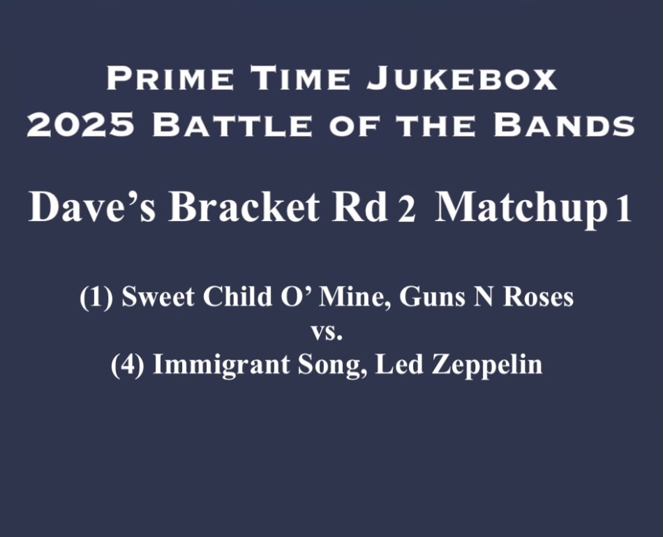 Dave’s Bracket is in Round 2. It’s (1) Sweet Child O’ Mine by Guns N Roses vs. (4) Immigrant Song by Led Zeppelin